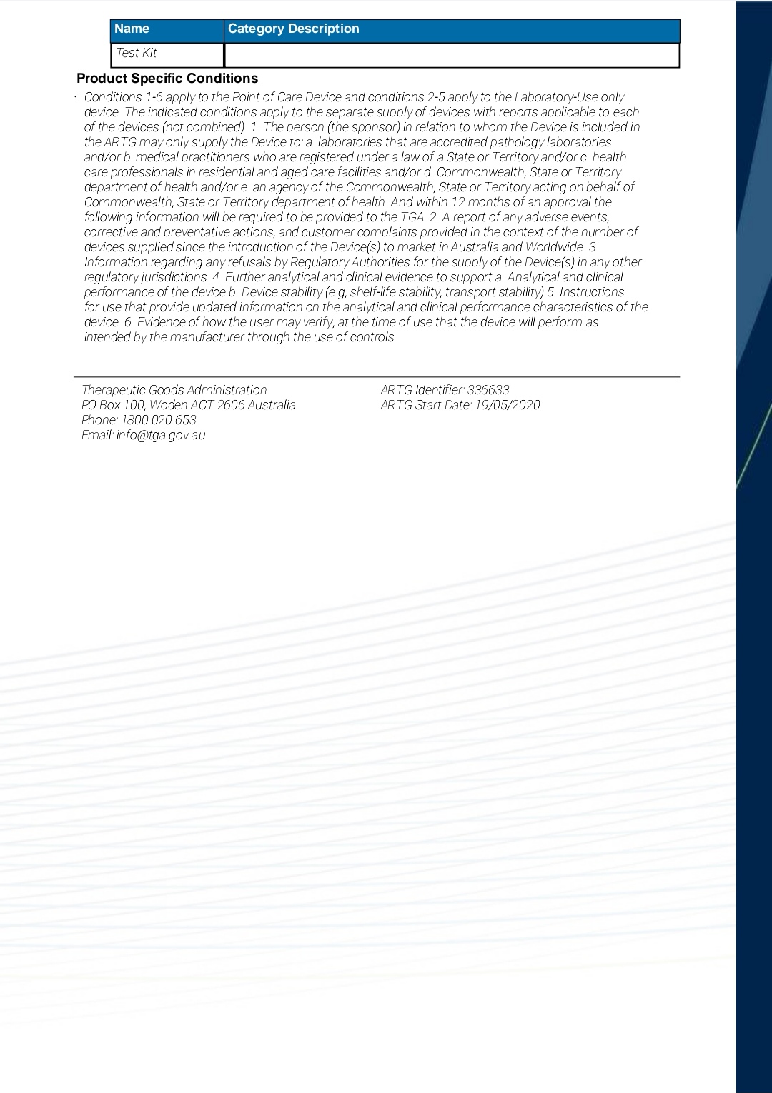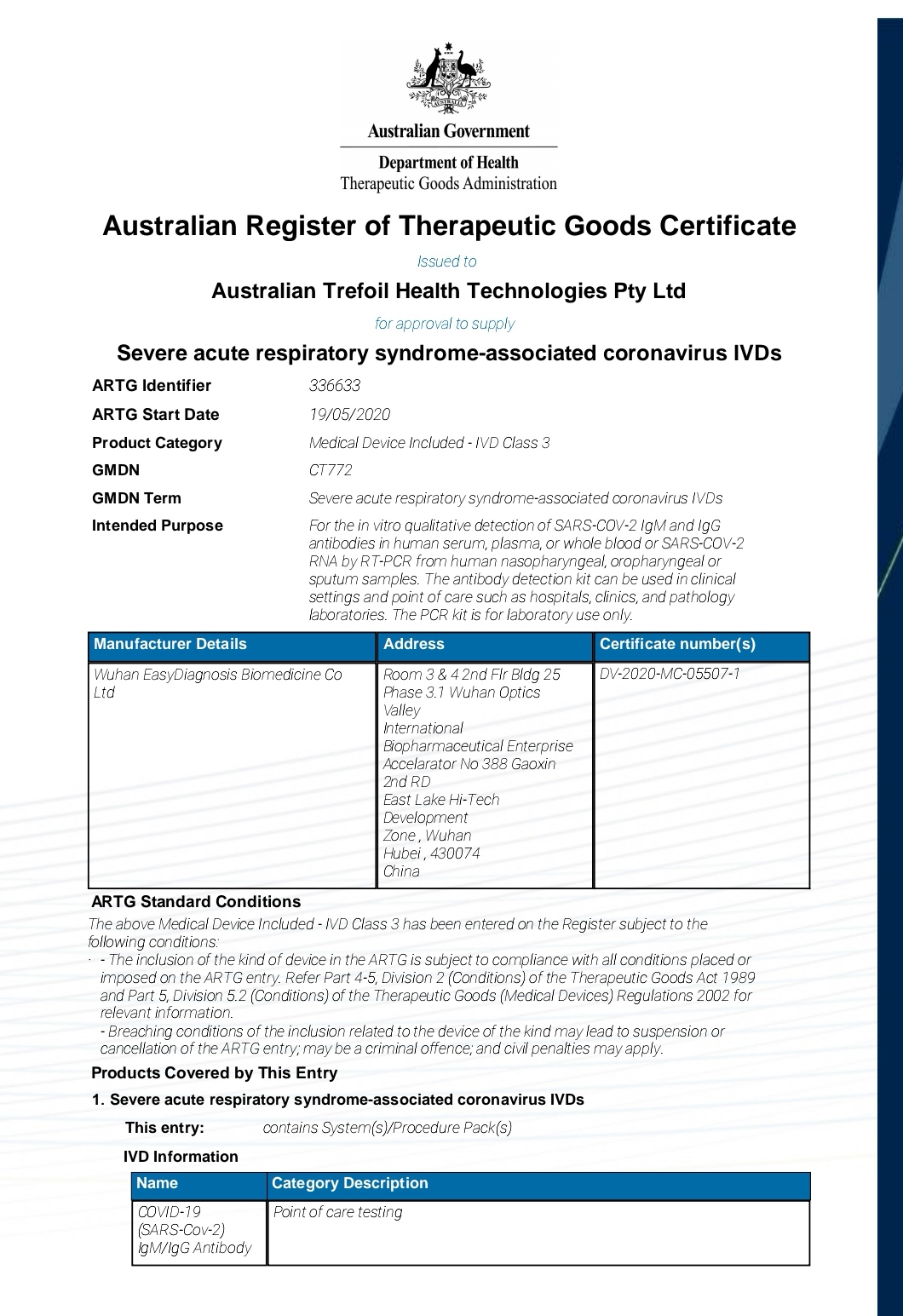 On May 19, 2020, the Therapeutic Goods Administration (TGA) officially included our SARS-CoV-2 IgM/IgG Antibody Test Kit and COVID-19 (SARS-CoV-2) Nucleic Acid Test Kit (PCR-based) in the Australian Register of Therapeutic Goods (ARTG Entry: 336633, Submission ID: DV-2020-IVA-06156-1 / DA-2020-02388-1).